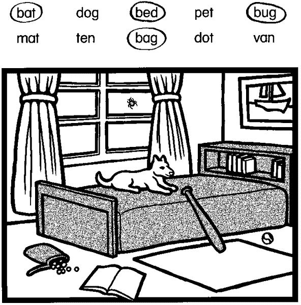Underline the words on the worksheet that have a short e sound in them. (bed, pet, ten) Write all of the words that begin with a b on another sheet of paper. Underline the vowel in each word. (bat, bed, bug, bag)