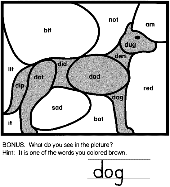 On another sheet of paper, write all of the words that begin with a d. Underline the vowel in each word. (dug, den, dad, dog, did, dot, dip) Write all the words that have a short i sound in them. (bit, lit, dip, did, it) How many did you find? (5)