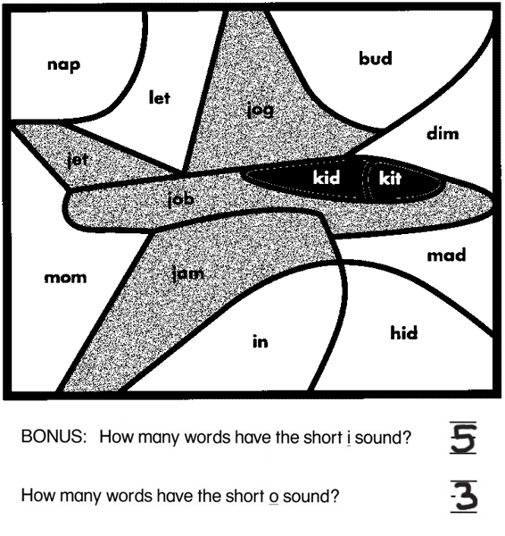 Write the two words that begin with a k. Underline the vowel in each word. (kid, kit) Write the four words that begin with a j. Underline the vowel in each word. (jet, job, jog, jam)