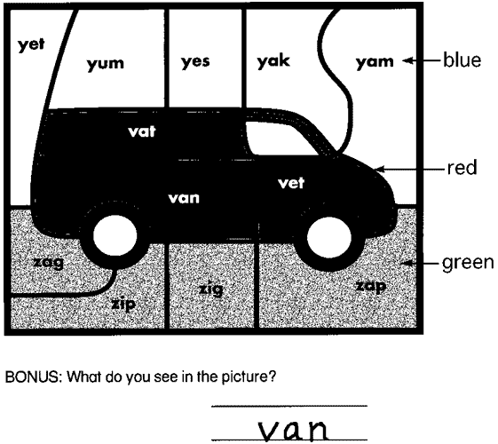 How many of the words on this page begin with a y? Write the number beside the yak. (5) How many words begin with a v? Write the number beside the vase. (3) How many words begin with a z? Write the number beside the zebra. (4) Write the words that begin with a y on another sheet of paper. (yet, yum, yes, yak, yam) Draw the animal that begins with a y. (yak)