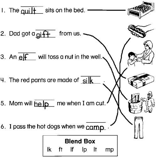 On another sheet of paper, write the new words that you made. Underline their ending consonant blends. Hint: Look at the Blend Box for help. (camp, gift, elf, silk, help, quilt,) Make a sentence using one of your new words.